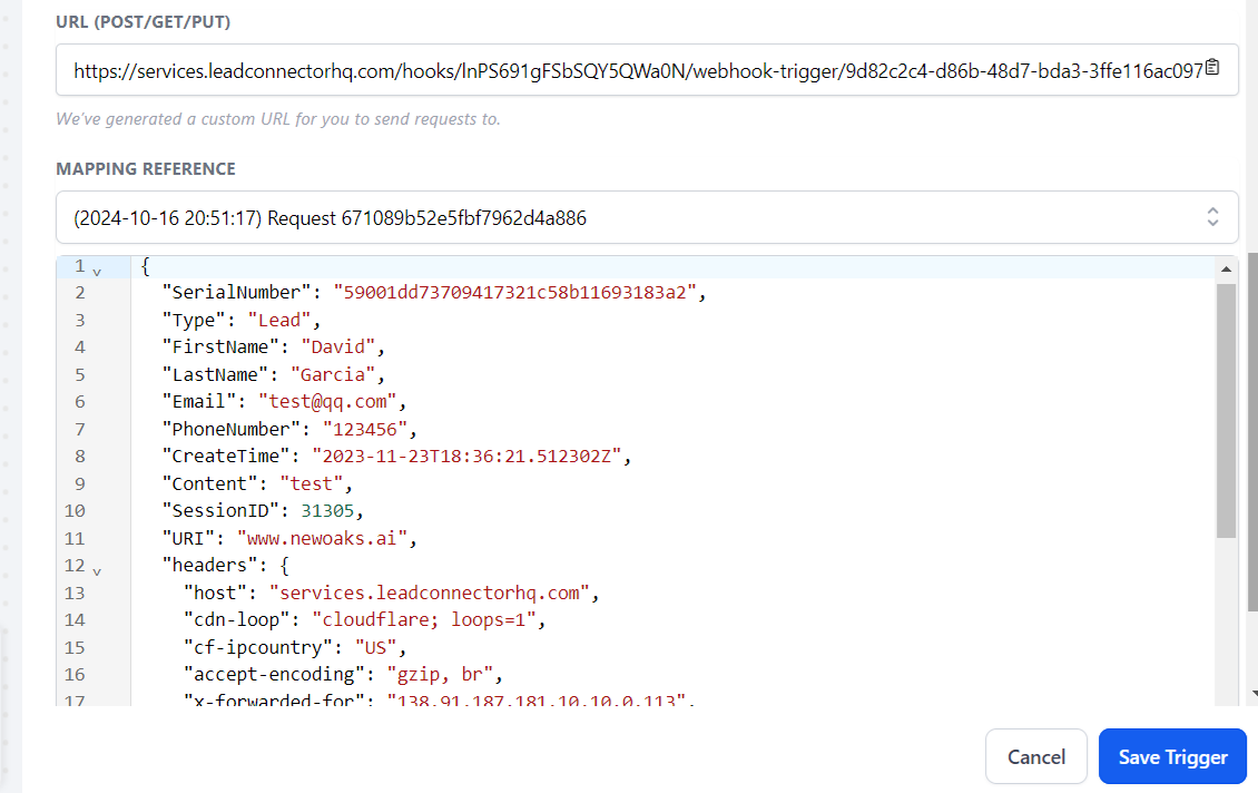Go back to GoHighLevel website, click “Fetch Sample Requests” button to get lead information